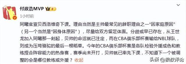 媒体人付政浩发文点评:“同曦官宣贝西洛维奇下课,理由当然是主帅最常见的辞职理由之一“因家庭原因”(另一个当然是“因身体原因”),尽量给双方留足体面。
