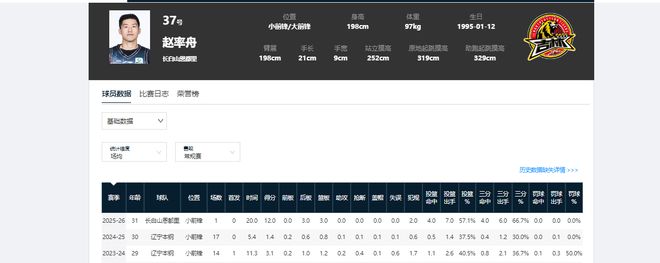 离开辽篮前的最后一个赛季,赵率舟没什么出场机会,也没什么战术地位,场均仅能获得5.4分钟出场时间,场均数据为1.4分0.8篮板。
