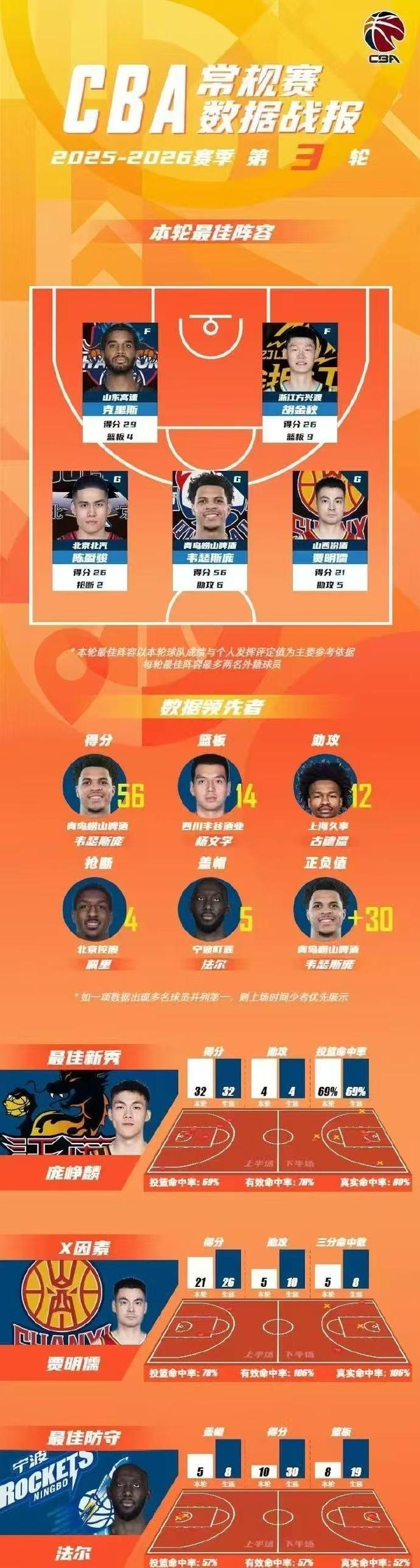 CBA官宣常规赛第3轮最佳阵容,青岛外援韦瑟斯庞不到25分钟狂轰56+6+6,贡献本赛季CBA最强单场表现领衔入选,陈盈骏26分连续两轮入选,胡金秋26+9、贾明儒21+5与克里斯29分也上榜。