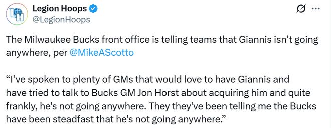 北京时间12月29日,据名记斯科托报道,密尔沃基雄鹿队管理层正向其他球队明确表态,字母哥不会离队。
