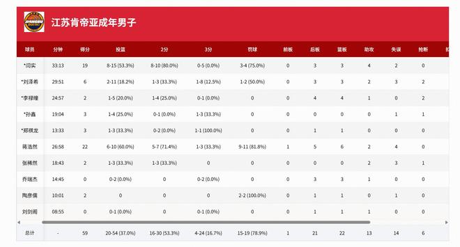 江苏男篮蒋浩然22分6板2助,闫实19分3板3助,刘泽希6分3板1助2断;
